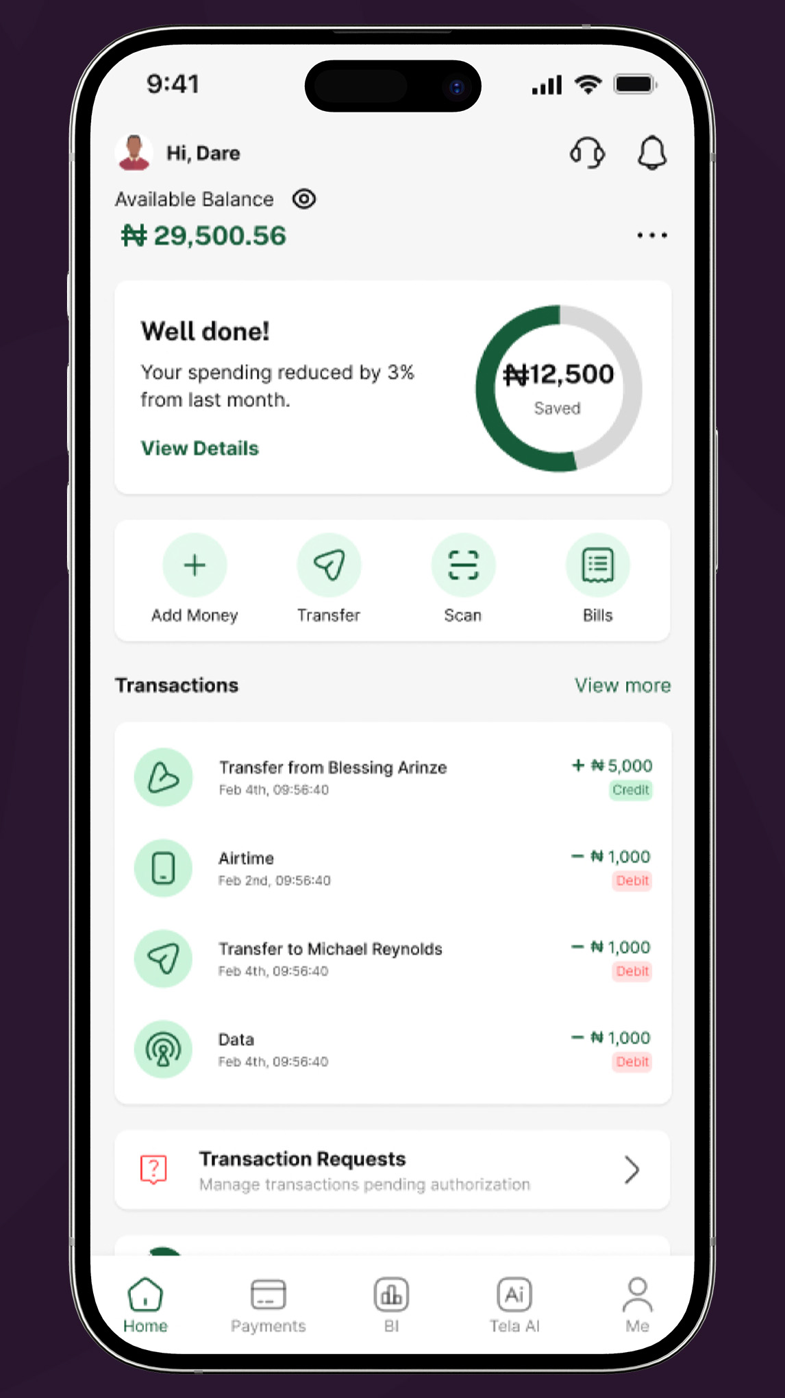 If your balance runs low, you can apply for an overdraft directly in the TELA app. Approved users can access instant credit for urgent payments.